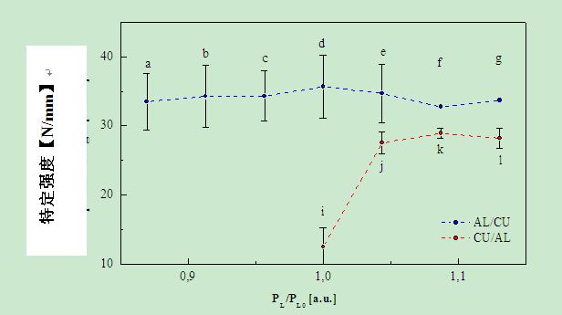 但銅-鋁焊接情況有所不同。結(jié)果顯示:耐久性的最高水平大約為P0的110%(參見圖k)下獲得。可以觀察到焊縫根部上明顯的鋁銅混合物以及明顯的孔隙。通過稍微降低或提高混合比(圖.i/l),連接的抗拉強度相對快速下降。此外,在不進行大部分混合工作的情況下(如圖a)形成有同等耐久性水平的連接是不可能的。為了實現(xiàn)特定耐久性,把鋁和銅進行混合似乎是必要的。