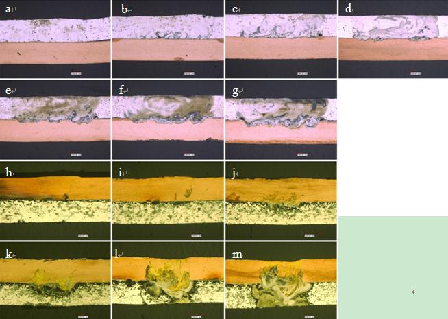 為了對隨材料混合比變化而變化的焊接連接耐熱沖擊性進行測試,根據(jù)標準DIN EN 60068-2-14Na ,對銅-鋁(圖j,k,l)和鋁-銅焊接口(圖a,d,g)的3組參數(shù)進行了溫度沖擊處理。也就是說,焊縫必須在2周內(nèi)(超過30分鐘,最大轉(zhuǎn)移周期為30秒)經(jīng)受-40°C~130°C下的300個周期的測試。所測試焊縫的長度為20毫米,且在測試設(shè)置期間消除了應力集中的情況。內(nèi)部結(jié)果和外部結(jié)果都顯示了該類型的溫度沖擊荷載對焊接連接的耐久性沒有影響。