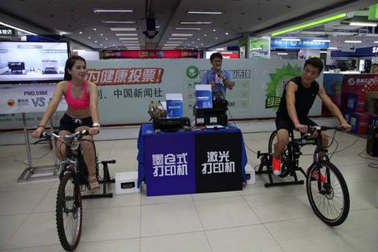 一個陽光美少女以19km/h的速度輕松騎行自行車,通過發(fā)電裝置,帶動墨倉式打印機(jī)不到1分鐘即成功打印出一份彩色文檔,另一邊,男生以30km/h的速度奮力趕超,一分鐘過去了,激光打印機(jī)仍然無法正常啟動。這就是在“中國低碳榜樣,為健康投票”活動大連站發(fā)生的精彩一幕。