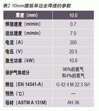 圖3顯示了船舶制造工業(yè)中球扁鋼型材T形接頭單邊全焊透,腹板厚度約為10mm(表2)。激光光束與水平板成12°的入射角,GMAW焊槍傾角為45°。
