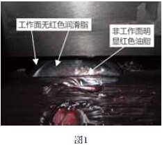 主軸軸承上方腔體內(nèi)潤滑脂很少,軸承內(nèi)圈滾道上有潤滑脂,而滾子可見的非工作面有紅色潤滑脂,而工作表面局部區(qū)未見紅色潤滑脂(Mobil SHC Grease 460 WT 為紅色潤滑脂),在滾子表面沒有紅色潤滑脂的區(qū)域用手觸摸,感覺有一層粘粘的無色油膜。如圖1 所示。