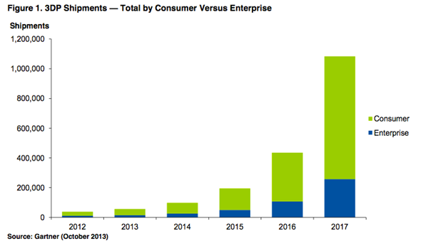 根據(jù)知名市場研究公司Gartner的最新預(yù)測,全球3D打印機(jī)(3DPS)的出貨量將從2014年的108151臺(tái)猛增至2015年的217350臺(tái)。2015年至2018年之間,全球3D打印機(jī)出貨量每年將增長一倍以上,到2018年達(dá)到230萬臺(tái)。