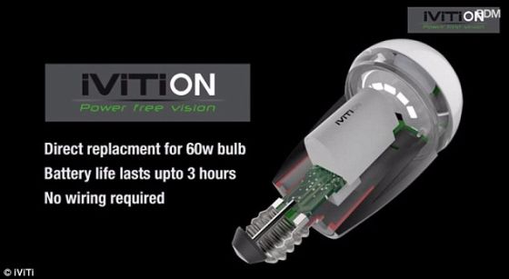 iViTi On可區(qū)分停電和有人關(guān)掉電源開關(guān),所以人們可根據(jù)需要將iViTi On關(guān)掉。它可安裝到一個普通燈泡內(nèi),而且無需附件任何線路。它的發(fā)光亮度相當(dāng)于一個普通的60瓦燈泡,但它僅需8瓦電力。照片展示了內(nèi)部電池的剖面圖。