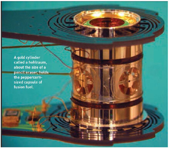 為了在地球上實現(xiàn)瞬間能夠媲美恒星和行星內(nèi)核的1億度高溫和一千億倍大氣壓的超高溫超高壓環(huán)境,NIF的大量工作始于一個9.425mm長,5.75mm直徑的金制圓柱空腔,即黑體輻射腔。在輻射腔內(nèi)是一個2mm的球體,內(nèi)含一個冰凍的氘-氚球混合冷凍的氘-氚氣體。該球體包裹在摻雜硅的塑料外殼內(nèi)。黑體輻射腔的靶——其尺寸就如同鉛筆上的橡皮那么大——放置在一個10米直徑的球形靶室內(nèi),而該靶室又位于NIF裝置的“中央車站”內(nèi),那是一個混凝土制的圍墻,其高度和直徑都是30米。