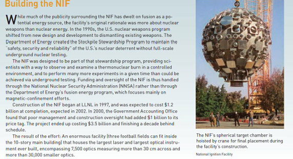 1997年NIF在LLNL動工開建,預(yù)計花費12億美元,并于2002年竣工。在2000年,政府會計辦公室發(fā)現(xiàn)建設(shè)監(jiān)督和管理不善,已經(jīng)比預(yù)計標價多出10億美元。最終該建設(shè)項目花費 35億美元,且比計劃晚了十年建成。