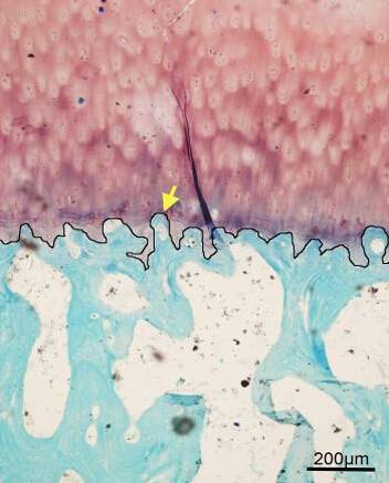 圖1關(guān)節(jié)上軟骨/骨聯(lián)合縱切的組織學(xué)染色切片(a)及軟骨下骨掃描電鏡圖(b)