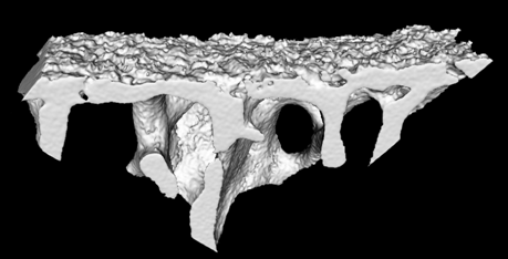 利用連續(xù)組織學(xué)染色切片和實(shí)驗(yàn)室開發(fā)的關(guān)節(jié)骨軟骨界面無創(chuàng)剝離技術(shù)獲得的軟骨與骨界面分離的電鏡數(shù)據(jù)(圖1),結(jié)合計(jì)算機(jī)醫(yī)學(xué)掃描圖像數(shù)據(jù)(MicroCT)和反求工程技術(shù),構(gòu)建起關(guān)節(jié)軟骨與骨界面顯微三維結(jié)構(gòu)模型,定量化給出關(guān)節(jié)軟骨、骨及其界面多層次典型結(jié)構(gòu)特征、統(tǒng)計(jì)學(xué)規(guī)律與參數(shù)化模型。研究發(fā)現(xiàn)關(guān)節(jié)上軟骨與骨的聯(lián)接是通過包括軟骨、軟骨下骨板以及關(guān)節(jié)面附近的松質(zhì)骨等多個(gè)層次復(fù)合結(jié)構(gòu)。特別是軟骨層和軟骨下骨板層的上表面分布著很多圓孔結(jié)構(gòu),孔徑平均值分別為17.04μm,34.08μm,且其孔隙主要以三邊形、四邊形等方式排布。通過多孔板狀結(jié)構(gòu)軟骨下骨(圖2),軟骨以鉚合、嵌鎖、管道連接、分子連接等方式連接于骨面。因此,我們提出軟骨層和軟骨下骨板層上的孔結(jié)構(gòu)可能是營養(yǎng)供給的通道的假設(shè)。而目前臨床上對(duì)關(guān)節(jié)軟骨的修復(fù)治療一直都未取得突破性的進(jìn)展,尤其對(duì)關(guān)節(jié)軟骨修復(fù)后的退變?nèi)狈τ行У氖侄?,這可能是由于對(duì)軟骨下骨在軟骨修復(fù)中的重要作用未予以足夠重視,忽視了在非正常力學(xué)狀態(tài)下修復(fù)關(guān)節(jié)軟骨表型難以保持長(zhǎng)期的穩(wěn)定性,進(jìn)而影響了關(guān)節(jié)軟骨的長(zhǎng)期修復(fù)效果。