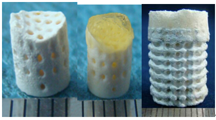實(shí)驗(yàn)室以生物陶瓷和水凝膠光固化3D打印成型技術(shù)(圖3)為基礎(chǔ),模仿關(guān)節(jié)軟骨與骨的層次結(jié)構(gòu),以結(jié)構(gòu)嵌入的方法將軟、硬不同的兩種材料復(fù)合成型制造骨軟骨支架。即首先以光固化3D打印成型具有多層次圓形孔隙的陶瓷骨體支架,然后以骨體支架為基底,在陶瓷支架表面以凍干成型或光固化3D打印成型水凝膠軟骨層后獲得軟骨/骨關(guān)節(jié)體(圖4)。
