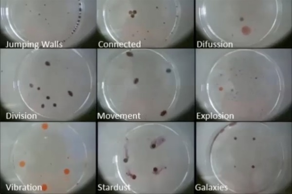 Cronin團(tuán)隊基本的研究過程是這樣的:機(jī)器人向培養(yǎng)皿中擠出化學(xué)組合物的液滴并跟蹤其發(fā)展。這些液滴由四種不同的化學(xué)物質(zhì)組成:1-penatol、1-octanol、鄰苯二甲酸二乙酯和十二烷(或辛酸(octanoic acid)),懸浮在堿性溶液中。機(jī)器人控制的設(shè)備一遍遍的擠出,每次都會出現(xiàn)不同的結(jié)果。如此反復(fù)進(jìn)行了數(shù)以百萬次(都是由機(jī)器人控制完成),已經(jīng)清楚的是,每次打印出的滴液行為都不相同,它們聚在一起,形成不同的組合物。