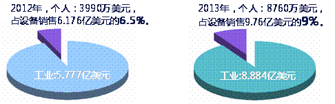從圖6的餅圖可以看出來,在2012年,個人3D打印機的銷售額僅僅占增材制造設(shè)備銷售額的5.5%,但是在2013年占了9%。