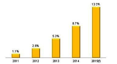 2011~2015年全球LED燈泡市場滲透率變化暨預(yù)測(來源:DIGITIMES,2014/12)