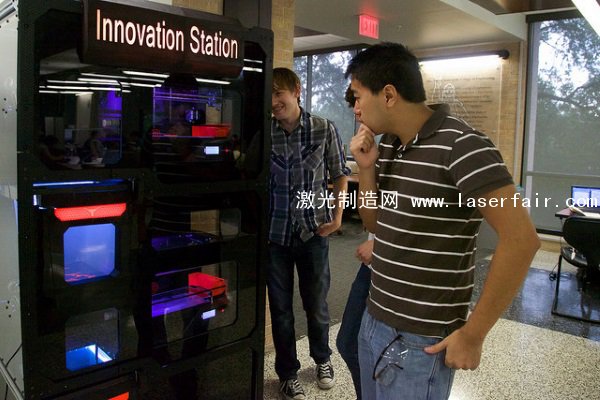 近日,德克薩斯大學Cockrell工程學院“T-Room”里出現(xiàn)了一臺與眾不同的“自動售貨機”。這臺名為Innovation Station的機器并不向?qū)W生供應零食和飲料,而是向?qū)W生們提供自助式3D打印服務。Innovation Station是由Cockrell工程學院的學生們制造的,任何德克薩斯大學的注冊學生都可以免費使用它。目前它已經(jīng)成功地為學生們打印出了幾十件3D對象。