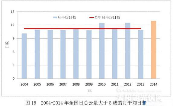 對固定式光伏發(fā)電,主要分析最佳斜面總輻射和年利用小時數(shù)(按80%的總體系統(tǒng)效率考慮)。 全國最佳斜面總輻射及光伏發(fā)電年利用小時數(shù)空間分布顯示(圖12、圖13),2014年,我國東北、華北、西北及西南大部最佳斜面總輻射年總量超過1400kWh/m2,年利用小時數(shù)在1100小時以上,其中新疆大部、青藏高原、甘肅西部、內(nèi)蒙古、四川西部及云南部分地區(qū),最佳斜面總輻射年總量超過1800kWh/m2,年利用小時數(shù)在1500小時以上,局部超過1800小時;四川東部、重慶、貴州中東部、湖南中西部及湖北西部地區(qū),最佳斜面總輻射年總量小于1000kWh/m2,年利用小時數(shù)不足800小時;其余地區(qū)最佳斜面總輻射年總量在1000~1400kWh/m2之間,年利用小時數(shù)在800~1100小時之間。 成因分析 2014年,冷空氣發(fā)生頻次偏少、強度偏弱是全國平均風(fēng)速偏小的主要原因。 年內(nèi),影響我國的冷空氣總頻次為18次,比常年偏少2.36次。其中,北方強冷空氣次數(shù)偏少2.45次,南方強冷空氣次數(shù)偏少1.18次,沒有寒潮過程(圖14)。此外,冬春季影響我國的冷空氣位置明顯偏西,是2014年平均風(fēng)速和最大風(fēng)速 在新疆和西藏等地區(qū)偏大、在中國東北至長江中下游地區(qū)偏小的主要原因。2014年,全國大部分地區(qū)云量增多,總云量大于8成的月平均日數(shù)增多,是近10年來的最大值(圖15),這是導(dǎo)致到達地表的太陽總輻射量減少重要原因之一。 |