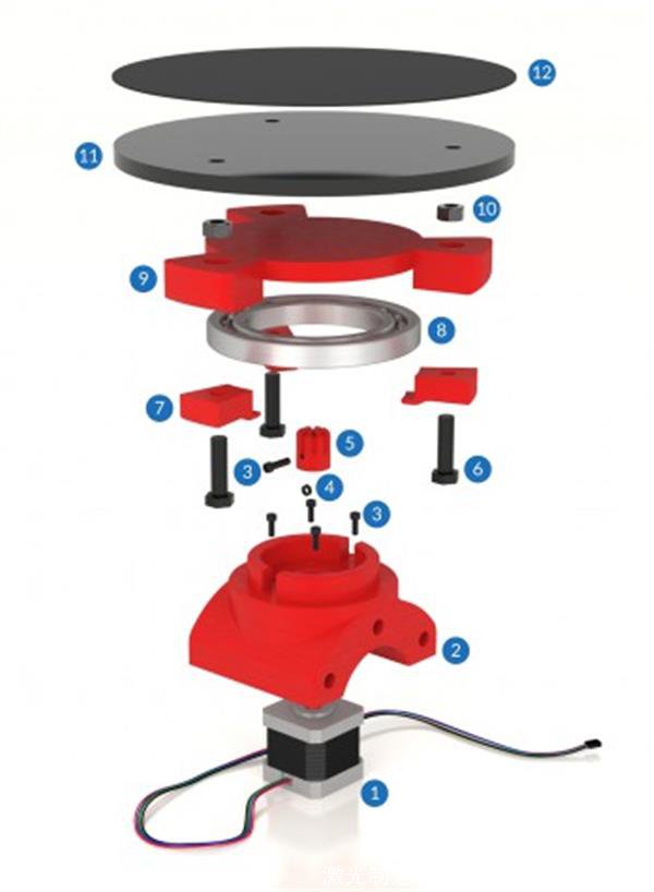 Ciclop設(shè)計的結(jié)構(gòu)全部都是用3D打印的部件組成的,包括外殼、M8螺紋桿、M8螺絲、M3螺絲、螺母和墊圈等。其20厘米半徑旋轉(zhuǎn)平臺則使用的是亞克力材料,并覆有防滑表面,以防止掃描的時候物體移動。轉(zhuǎn)盤由110毫米直徑的球軸承支撐著,并有一個NEMA 17步進電機推動其進行360度旋轉(zhuǎn)。