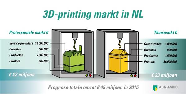 當(dāng)前荷蘭工業(yè)部門中所有機(jī)器制造商、金屬制造商和塑料制造商年銷售總額大約為1000億歐元。而據(jù)該報(bào)告的作者David Kemp在其銀行網(wǎng)站(荷蘭語(yǔ))中透露,雖然有很多增長(zhǎng)機(jī)會(huì)已經(jīng)顯露曙光,但荷蘭3D打印市場(chǎng)仍處于起步階段,2015年其市場(chǎng)容量預(yù)計(jì)將超過4500萬歐元。