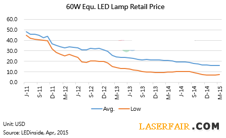 根據(jù)LEDinside研究資料顯示,2014年全球LED照明產(chǎn)值達210億美元,其中LED球泡燈占全體照明產(chǎn)品的數(shù)量高達一半左右,然而單價相對偏低,因此LED球泡燈的產(chǎn)值占比約37% 。儲于超表示,從2010年開始,LED球泡燈每年的降價幅度高達30%,雖然因為價格快速下滑而刺激出大量的需求,但是惡性價格競爭使照明廠商利 ??潤不斷的衰減,在LED球泡燈的出貨數(shù)量與獲利跟不上傳統(tǒng)光源的情況下,導(dǎo)致飛利浦與歐司朗都想要把原有的照明業(yè)務(wù)做分拆。