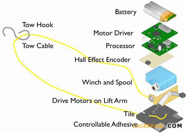 與壁虎一樣,機(jī)器人MicroTugs的底部覆蓋著數(shù)以千計(jì)微小的、毛發(fā)狀橡膠“鞋釘”,這些小“鞋釘”能夠彎曲并粘附在任何表面上,形成超強(qiáng)粘力。一旦被鎖定到地面上,MicroTugs就是有自帶的馬達(dá)拖著它的負(fù)載(通過纜線和吊鉤)向前行?;蛟S您會(huì)問了,粘得那么結(jié)實(shí)機(jī)器人怎么邁腿啊?其實(shí),只要一個(gè)指令,這些彎曲的“鞋釘”就可變直,機(jī)器人相應(yīng)的腳就可以輕松離開地面了。