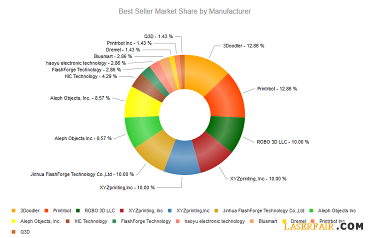 在亞馬遜上銷售的3D打印機(jī)品牌就更多了,可惜的是數(shù)據(jù)采集的實(shí)際較短。不過下面的圖表仍然讓您對(duì)于什么品牌在亞馬遜上賣得最好有個(gè)清晰的概念。售價(jià)145美元的3D打印筆3Doodler目前處于領(lǐng)先地位。除此之外是Printrbot、ROBO 3D、XYZprinting和閃鑄。
