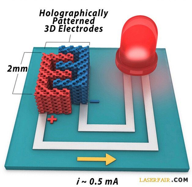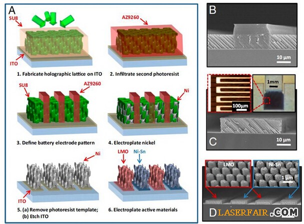 研究人們將3D全息光刻(3D holographic lithography)技術(shù)與更為常規(guī)的2D光刻(一種與常見(jiàn)的印刷電路板相似的技術(shù))結(jié)合起來(lái)制造出介孔結(jié)構(gòu)電極。所有這些研究的細(xì)節(jié)已經(jīng)被 發(fā)表在一片題為《高性能芯片內(nèi)3D鋰離子微電池的全息結(jié)構(gòu)(Holographic Patterning of High Performance on-chip 3D Lithium-ion Microbatteries)》的論文中,這篇論文被收錄于美國(guó)國(guó)家科學(xué)院的論文集中。