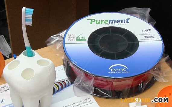除此之外,展會(huì)現(xiàn)場(chǎng)還出現(xiàn)了一款值得一提的新型線(xiàn)材Purement,這是世界上第一款具有抗菌能力的3D打印材料。由于3D打印技術(shù)一般是層積式構(gòu)建,因此打印出來(lái)的對(duì)象往往會(huì)成為許多細(xì)菌,包括大腸桿菌和沙門(mén)氏菌,的溫床。但Purement是經(jīng)過(guò)認(rèn)證的環(huán)保型的抗菌材料,它會(huì)使得3D打印出來(lái)到東西對(duì)于細(xì)菌來(lái)說(shuō)不那么具有吸引力。因此,它非常適合于3D打印玩具、廚房用品以及醫(yī)療用品等。
