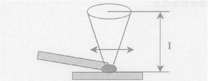 在車頂?shù)臋C(jī)器人編程及焊接實(shí)踐中,關(guān)鍵在與確定焦點(diǎn)的大小和相對(duì)位置。如圖4所示,錐形體代表入射激光,斑點(diǎn)代表落在焊縫表面的激光焦點(diǎn),兩個(gè)搭接的陰影塊分別代表待焊的車頂和側(cè)圍零件。調(diào)整聚焦鏡組與焊縫上下的距離L就可以改變焦點(diǎn)的大小,調(diào)整左右的距離便可確定焦點(diǎn)相對(duì)于車頂和側(cè)框的位置。