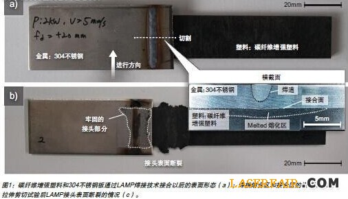 LAMP焊接技術(shù)可以牢固地將碳纖維增強(qiáng)塑料片材和304不銹鋼板焊接在一起,其中使用CW碟片激光器在金屬上生成不焊透焊縫。圖1顯示了聚丙烯腈(PAN)型PA基材碳纖維增強(qiáng)塑料片材與304不銹鋼板之間的激光搭接接頭在做拉伸剪切試驗(yàn)前、后的情況。其中,碳纖維增強(qiáng)塑料片材厚度為3mm、寬度為20mm,具有較長(zhǎng)的碳纖維,不銹鋼板厚度為3mm、寬度為30mm。橫截面的照片(見圖1中的插圖)顯示了不銹鋼中淺層小孔形成的激光焊道。此外,熔化區(qū)廣泛分布在碳纖維增強(qiáng)塑料片材中靠近接合面的區(qū)域。在圖1b中,我們可以觀察到黑色的碳纖維增強(qiáng)塑料片材粘結(jié)在304不銹鋼板的底表面。特別是,粘結(jié)的碳纖維增強(qiáng)塑料部分主要根據(jù)激光焊道下的不銹鋼板而識(shí)別出來(lái)。在碳纖維增強(qiáng)塑料片材的接合面中也能看到不銹鋼的部分。上述事實(shí)表明形成牢固的焊接接頭是可行的。