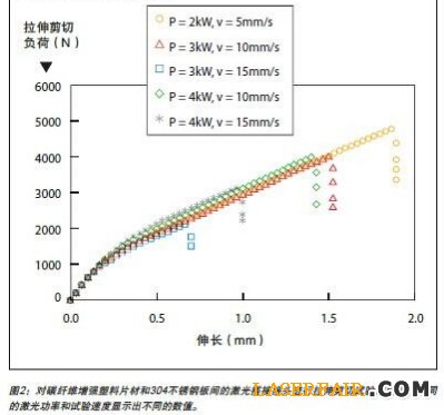 圖2顯示了在不同碟片激光輻照條件下對(duì)接頭進(jìn)行拉伸剪切試驗(yàn)的結(jié)果。結(jié)果表明,接頭的最大拉伸剪切負(fù)荷(強(qiáng)度)約為4800N(20mm寬的碳纖維增強(qiáng)塑料),這一結(jié)果是在功率為2kW和5mm/s的試驗(yàn)速度的情況下得出,高于碳纖維增強(qiáng)塑料板的拉伸剪切負(fù)荷的一半。30mm寬、3mm厚的PA塑料片材與304不銹鋼板之間接頭的拉伸剪切負(fù)荷最大約為3400N。從中我們可以判斷,20mm寬的碳纖維增強(qiáng)塑料和304不銹鋼板之間接頭的最大負(fù)荷要遠(yuǎn)高于30mm寬的PA塑料片材與鋼板間的接頭。因此,通過(guò)在具有更長(zhǎng)碳纖維的聚丙烯腈(PAN)型PA基材碳纖維增強(qiáng)塑料片材和304不銹鋼板之間形成搭接接頭,可以得到最高的負(fù)荷。