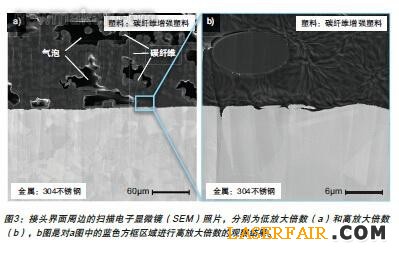 圖3為碳纖維增強(qiáng)塑料片材和304不銹鋼板之間接頭接合面的掃描電子顯微鏡(SEM)照片。許多亞毫米大小的氣泡不規(guī)則地分布在碳纖維周圍的塑料基體中,這是由激光焊接過(guò)程中溶池的高溫引起的熱傳導(dǎo)造成的。據(jù)證實(shí),碳纖維增強(qiáng)塑料中氣泡的幾何特征主要取決于塑料和碳纖維的疊合形狀,以及傳導(dǎo)熱量的水平和碳纖維的長(zhǎng)度。據(jù)悉,與普通塑料相比,碳纖維增強(qiáng)塑料中更容易形成氣泡。對(duì)普通塑料來(lái)說(shuō),氣泡只形成在界面附近;而在碳纖維增強(qiáng)塑料中,由于纖維表面與基體之間的不穩(wěn)定以及碳纖維具有較高的熱導(dǎo)率,所以氣泡廣泛分布在塑料基體中。