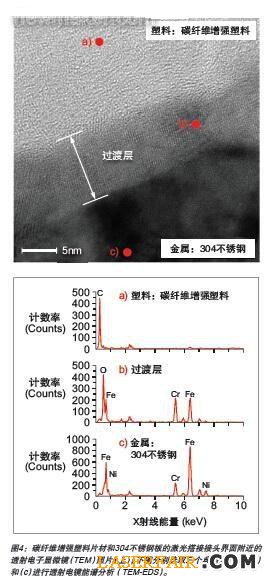 圖4是接頭界面附近的透射電子顯微鏡(TEM)照片,從PA基體、不銹鋼上的氧化膜、不銹鋼基體中分別選取典型的點(diǎn)來(lái)進(jìn)行透射電鏡能譜分析(TEM-EDS)。我們可以觀察到,碳纖維增強(qiáng)塑料從原子或分子尺度上被連接在304不銹鋼的10納米厚的鉻鐵(Cr-Fe)氧化層上。這表明,化學(xué)鍵合和物理(范德華力)粘結(jié)的可能性很高。因此,碳纖維增強(qiáng)塑料和304不銹鋼能被牢固地接合在一起形成強(qiáng)而有力的接頭。