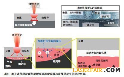 進(jìn)一步地,在7×10^-6帕的高壓下,從碳纖維增強(qiáng)塑料片材向不銹鋼板鉆一個(gè)2mm的孔,并測(cè)量鉆孔過(guò)程中揮發(fā)氣體的壓力水平和質(zhì)譜,再通過(guò)Q-質(zhì)譜儀來(lái)分析氣泡中的氣體成分。結(jié)果表明,氣泡內(nèi)的氣體成分為氮?dú)?、氫氣和碳纖維增強(qiáng)塑料的PA基體裂解產(chǎn)生的烴類氣體。由于裂解后產(chǎn)生氣泡并迅速擴(kuò)張,高壓迫使熔化的塑料進(jìn)行移動(dòng)并流入金屬表面的坡口或晶界。從所有試驗(yàn)中我們可以推斷出接合機(jī)制(見圖5),即,碳纖維增強(qiáng)塑料復(fù)合材料與不銹鋼直接接合,是通過(guò)化學(xué)或物理地粘結(jié)熔化的塑料和覆蓋在不銹鋼上的氧化膜來(lái)實(shí)現(xiàn)的,此外還要考慮塑料流動(dòng)到坡口或晶界而引起的機(jī)械錨固效應(yīng)。