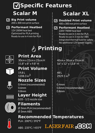 Scalar M很明顯是兩款3D打印機(jī)中較小的一款,但是仍然提供了相當(dāng)大的3D打印尺寸,達(dá)到30×22×25厘米;Scalar XL的功能與之相同,但是其打印尺寸更大,達(dá)到40×30×35厘米。