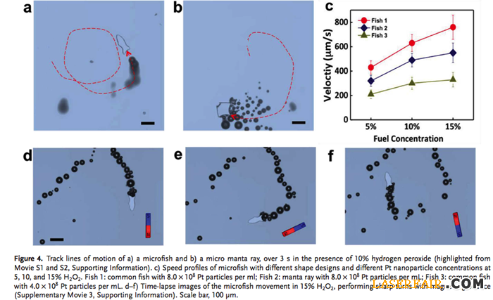 研究人員還能夠?qū)⑵渌{米材料與PEGDA樹脂混合在一起,比如磁性鐵氧化物,以及催化鉑等。在該論文詳述的實驗中,他們能夠?qū)⒀趸F打印到微型魚的頭部,把催化鉑打印到其尾部,從而能夠精確地控制魚的運動。通過使用過氧化氫,它們可以與鉑納米微粒產(chǎn)生化學(xué)反應(yīng),從而作為燃料推動微型魚前進,而鐵氧化物的磁性可以控制其轉(zhuǎn)向。同時,根據(jù)打印不同形狀的微型魚,以及調(diào)整過氧化氫的使用量,研究人員能夠以控制微型魚在液體中游泳的速度。