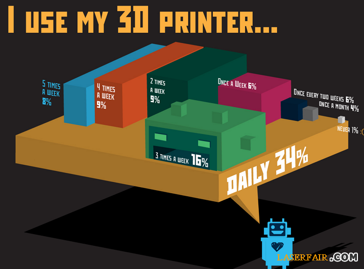 這501名受訪者還表示,平均而言,他們每個月3D打印21個對象,而且受調(diào)查者的34%每天都進(jìn)行3D打??;而11%的人說他們只是偶然用一下3D打印機(jī);超過50%的人表示他們每周至少用4次3D打印機(jī)。