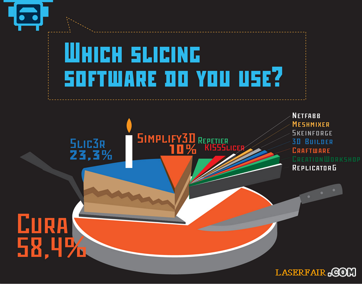 在切片軟件方面,58%的受訪說他們使用Cura,23%的人使用Slic3r,使用Simplify3D的有10%。(注:Cura是Ultimaker開發(fā)的,因此YouMagine可能更為偏愛Cura)