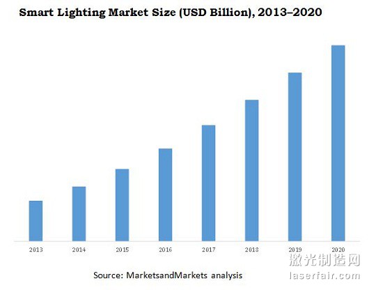 全球照明市場(chǎng)的主要“球員”包括Philips(荷蘭)、歐司朗(德國(guó))、Acuity Brands Lighting(美國(guó)),通用電氣(美國(guó))等。報(bào)告中也表示,智能照明市場(chǎng)主要的限制是關(guān)于安裝成本和投資回收期缺乏認(rèn)識(shí)。下圖顯示了智能照明市場(chǎng)2013年至2020年的預(yù)計(jì)增長(zhǎng)。