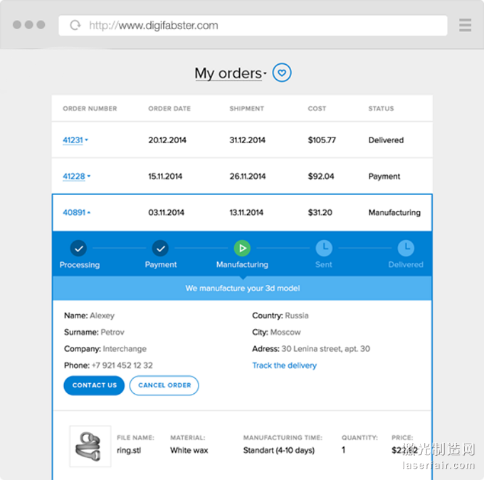 DigiFabster的云服務(wù)還能夠提供基于網(wǎng)絡(luò)賬戶的個人設(shè)置、文件存儲,以及訂單跟蹤、訂單狀態(tài)如交付日期和生產(chǎn)時間表等信息,這些都可以通過一個簡單的界面展示出來。