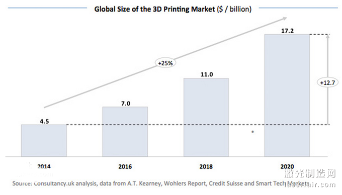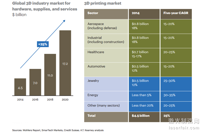 來(lái)自該報(bào)告的數(shù)字表明,全球3D打印市場(chǎng)預(yù)計(jì)將從當(dāng)下的45億美元增長(zhǎng)至2020年的172億美元。這些數(shù)字意味著未來(lái)五年全球3D打印行業(yè)將以25%的年均速度增長(zhǎng),其中能源領(lǐng)域、以及珠寶領(lǐng)域?qū)⑻峁┲匾脑鲩L(zhǎng)動(dòng)力。盡管這兩個(gè)行業(yè)看似相距甚遠(yuǎn)。