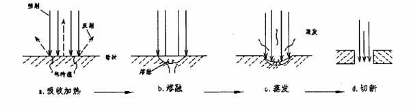 激光切割機(jī)的工作原理主要是將激光束聚焦成很小的光點(diǎn),其最小直徑(可小于0.1mm);使焦點(diǎn)處達(dá)到很高的功率密度(可超過106kw/cm2),這是光束輸入(光能轉(zhuǎn)換)的熱量遠(yuǎn)遠(yuǎn)超過被材料反射的傳導(dǎo)或擴(kuò)散部分,材料很快加熱至汽化溫度,蒸發(fā)形成孔洞,隨著光束與材料相對線性移動,使孔洞連接形成寬度很窄(如0.1mm左右)的切縫,切邊熱影響很小,基本沒有變形,無毛刺,精度高。切割過程如下示意圖:
