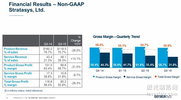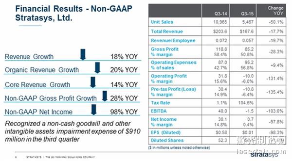 將這些數(shù)字對(duì)比來(lái)看,去年同期Stratasys的收入為2.03億美元,當(dāng)時(shí)的GAAP凈虧損為3130萬(wàn)。而在本期,該公司的non-GAAP利潤(rùn)為70萬(wàn)美元,而2014年第三季度的則是3010萬(wàn)美元。本次報(bào)告還指出,該公司第三季度已經(jīng)售出了5467/臺(tái)3D打印技術(shù)和增材制造系統(tǒng)。