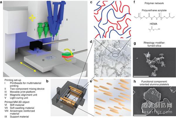 近日,蘇黎世聯(lián)邦理工學(xué)院(ETH Zürich)的復(fù)雜材料研究人員開發(fā)出了一種3D打印方法來開發(fā)設(shè)計具有精美微結(jié)構(gòu)特征的復(fù)合材料。在此之前,這種結(jié)構(gòu)特征只在自然生長的生物材料中見到過。利用這種“多材料磁力輔助3D打印系統(tǒng)(MM-3D printing),研究團(tuán)隊已經(jīng)有效地超越了3D成型能力,甚至進(jìn)入了一種5D設(shè)計空間。據(jù)稱這一技術(shù)最終可以開發(fā)出多功能的變形軟裝置,這種裝置可以用于創(chuàng)建類似人體肌腱或者肌肉的機械連接系統(tǒng),或者制造軟機器人的選擇性拾取-放置系統(tǒng)等。