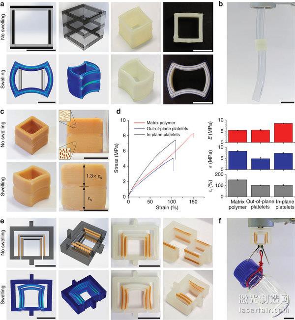 研究者還能夠使用這種3D打印平臺創(chuàng)造出軟性的機械緊固零件和3D變形的鎖鍵連接器。“雖然可以設(shè)想許多其他功能,但我們提供的例子包括利用非均質(zhì)復(fù)合材料的形變來制造軟性的機械緊固件,這種緊固件的工作原理非常特殊,它不需要任何化學(xué)粘合,完全可以根據(jù)緊固系統(tǒng)預(yù)先編程好的形狀變化帶驅(qū)動不同部件之間的機械互鎖。”
