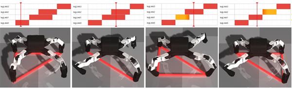 用戶任何影響運動的選擇(例如腿數(shù)目)都可以在屏幕中的模擬運動中表現(xiàn)出來,使其能夠檢測設計改變的效果。“尤其是,用戶可以改變其腿部站立和擺動的持續(xù)時間,以及改變其落腳的先后順序等。而我們的軟件提供的即時反饋使得用戶可以以交互的方式調(diào)整其走路模式,以找到滿意的解決方案。”他們寫道。通過這些數(shù)據(jù),系統(tǒng)會自動計算出其余的部分。研究人員在此過程中使用了該領域機器人的優(yōu)化模型(簡化的動力學模型),而這些也經(jīng)常會在模型預測控制(MPC)中使用。