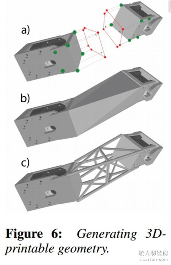 一旦迭代設計完成,該工具隨后會生成機器人的完整身體,包括可3D打印的電子元件的連接件等。“我們的系統(tǒng)會從帶伺服電機的CAD模型開始,就像插圖(見下文)那樣進行可視化。在預處理步驟中我們會生成兩種比較緊湊的3D模型,可以直接用螺釘或者螺釘或鉚釘將伺服電機裝在上面,并使之成為我們系統(tǒng)所產(chǎn)生的幾何形狀的一部分。”他們解釋說。在3D打印之前,用戶也可以修改模型以滿足他們的特殊(或者審美)需求。