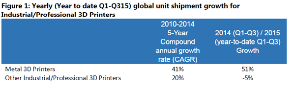 此外,2015年第三季度全球工業(yè)級/專業(yè)級3D打印機的總出貨量為2743臺,其中金屬3D打印機僅占7%。但是按照銷售金額計算,當季金屬3D打印機的銷售收入全球占比高達31%,比去年同期的22%又有提高。