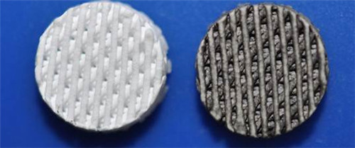 圖1. 3D打印純生物陶瓷支架(左)與生物活性陶瓷/氧化石墨烯復(fù)合支架(右)。