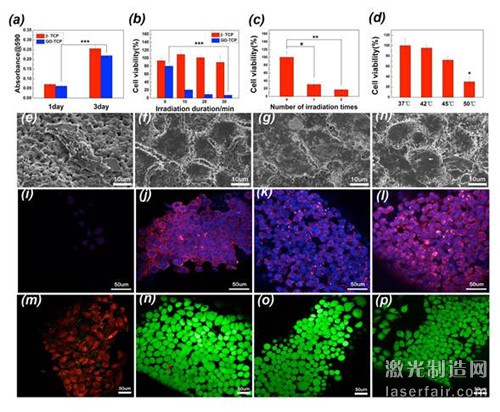 圖2. 3D打印生物陶瓷/石墨烯復(fù)合支架在近紅外光誘導(dǎo)的光熱效應(yīng)有效地殺死腫瘤細(xì)胞(b, c, d, e, f, and m),如果在沒有近紅外光照射以及純的生物陶瓷支架上,腫瘤細(xì)胞生長完好(a, f, g, h, j, k, l, n, o and p)。