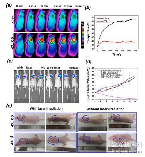 在體外骨腫瘤細(xì)胞殺傷率達到90%(見圖2)。在小鼠體內(nèi)植入該功能化的支架并進行光照后,有效地抑制了裸鼠皮下腫瘤生長,而對照組腫瘤體積隨天數(shù)持續(xù)增大(見圖3)。同時,該支架還能顯著促進骨間充質(zhì)干細(xì)胞的增殖與成骨分化,并誘導(dǎo)體內(nèi)新生骨組織的長入,從而賦予了3D打印生物陶瓷支架抗腫瘤和骨修復(fù)的雙功能性,在骨腫瘤的治療與修復(fù)中具有潛在的應(yīng)用。