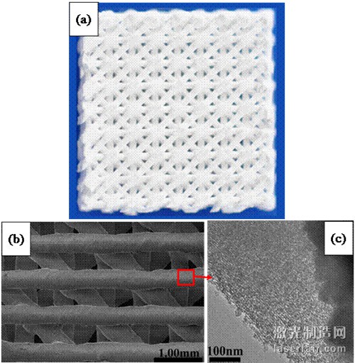 圖5. 3D打印具有編制大孔結(jié)構(gòu)(a, b)以及有序介孔結(jié)構(gòu)(c) 的多級孔結(jié)構(gòu)的生物陶瓷支架,該支架具有優(yōu)越的成骨活性。