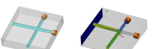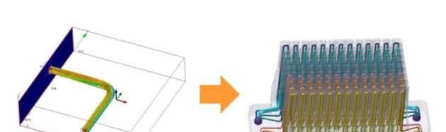 下面的例子中,不規(guī)則形狀的模具也可以使用等徑和等長度的多通道來冷卻。在這種情況下,八個(gè)冷卻通道,直徑均為3毫米,且長度相等,八個(gè)通道都連接到10毫米直徑的入口和出口來保證等量的流量。