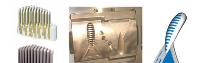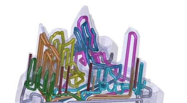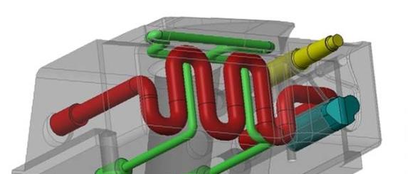 下面的例子中,這是一個(gè)有著無數(shù)薄的’手指’形狀的復(fù)雜冷卻通道的模具。 在每一個(gè)“手指”內(nèi)為了促進(jìn)均勻和快速冷卻,入口歧管分流成五和四平行通道,這些通道的直徑和長度相等。這樣的設(shè)計(jì)使得總冷卻通道長度超過十二米!